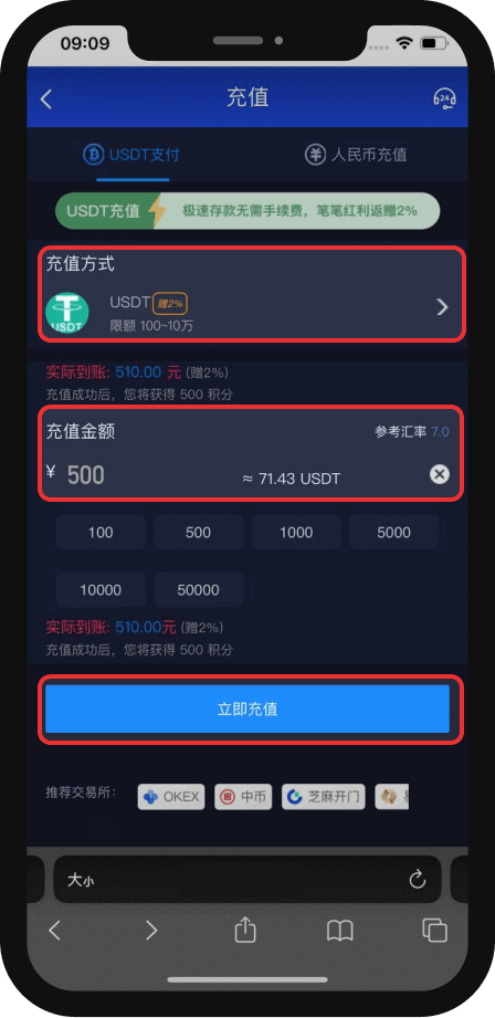• 1、进入UED体育充值页面,选择USDT支付,并输入充值金额,点击“立即充值”获取收款码。