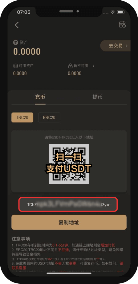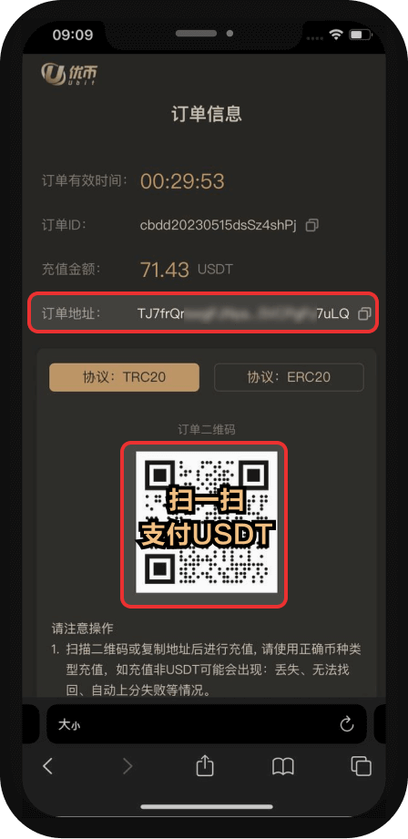 • 2、复制USDT付款地址或手机扫描付款二维码,去数字钱包支付。