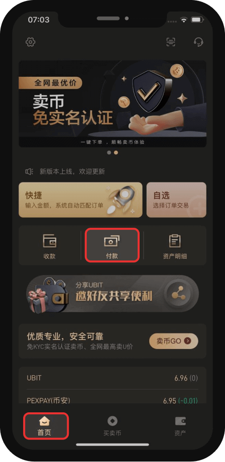• 4、您的数字钱包买币成功后,进入“首页”页面,选择“付款”。