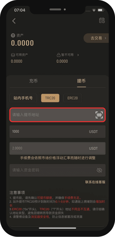 • 1、打开您的数字钱包,进入“充币”页面,复制“充币地址”